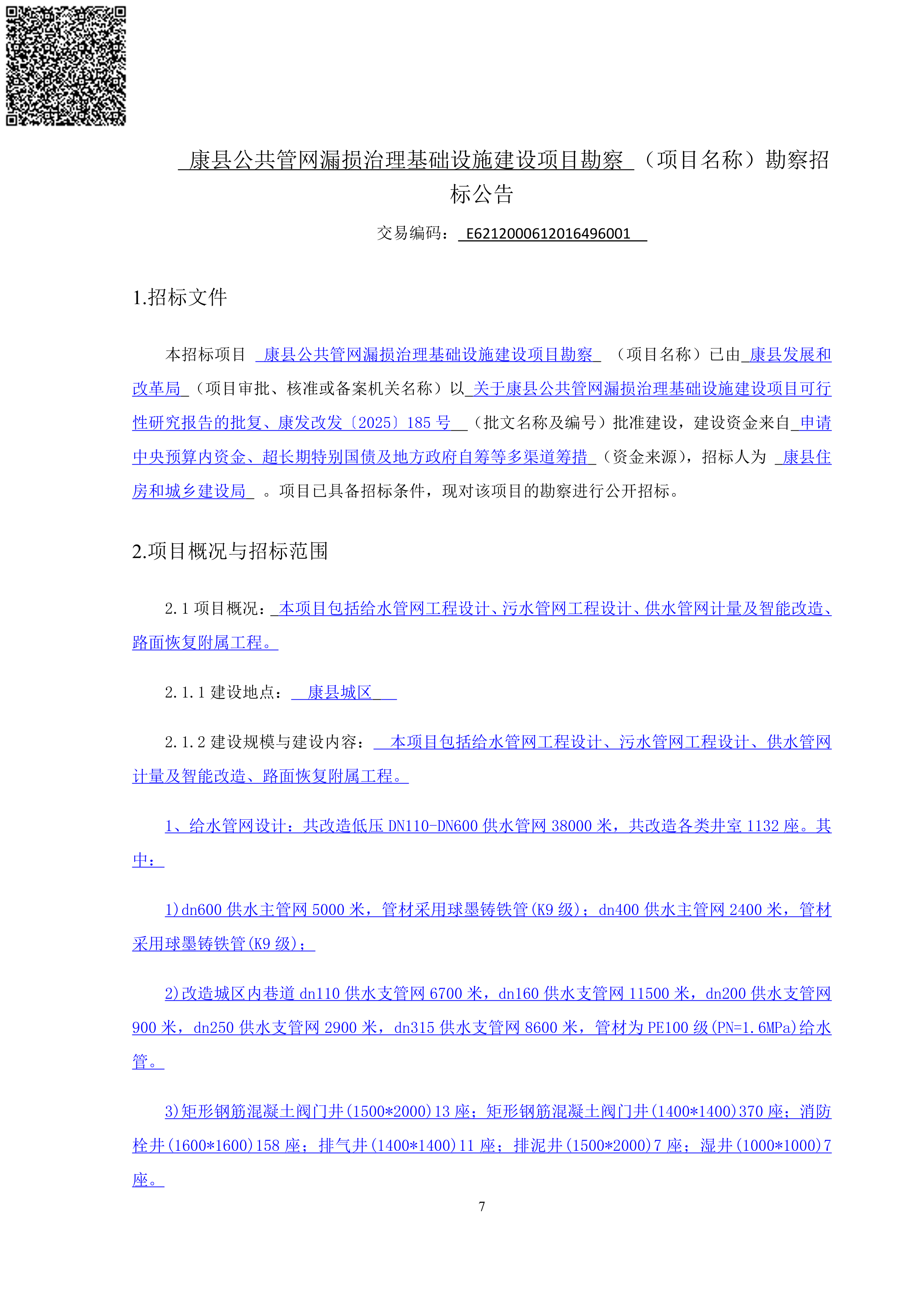 康县公共管网漏损治理基础设施建设项目勘察招标公告