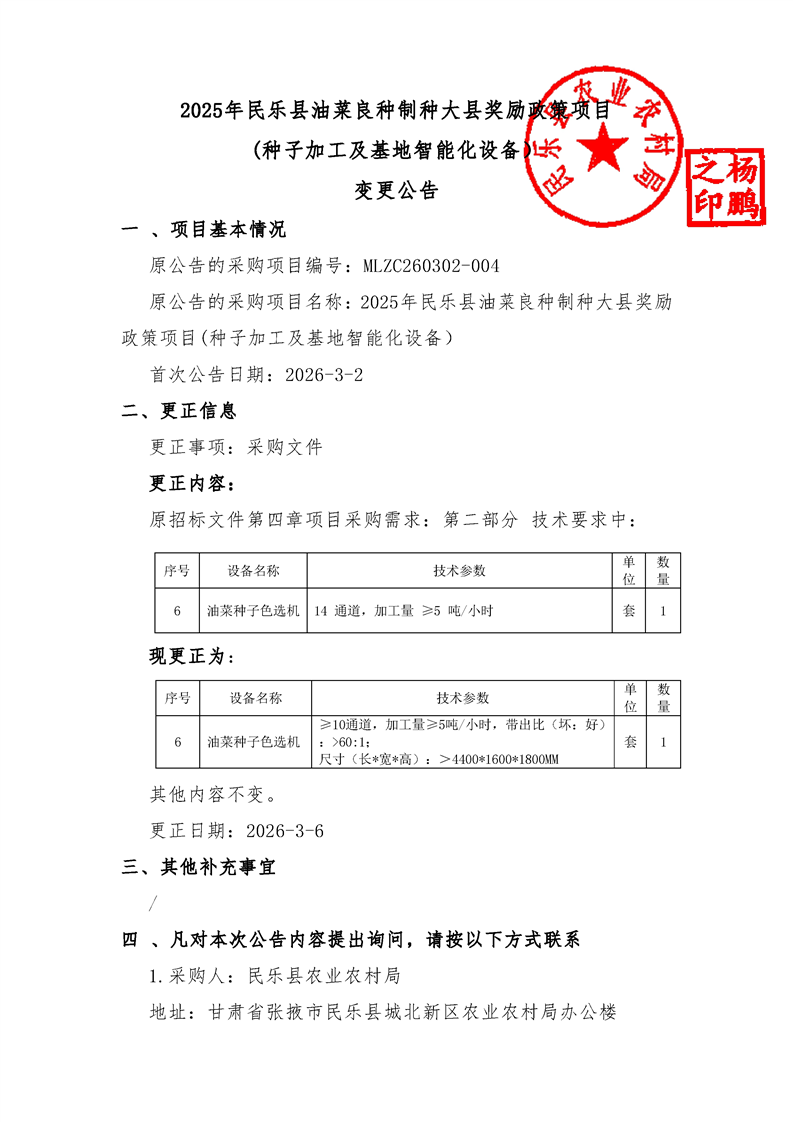 2025年民乐县油菜良种制种大县奖励政策项目(种子加工及基地智能化设备)变更公告
