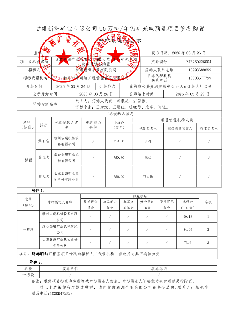 [市本级]甘肃新洲矿业有限公司90万吨年钨矿光电预选项目设备购置中标候选人公示