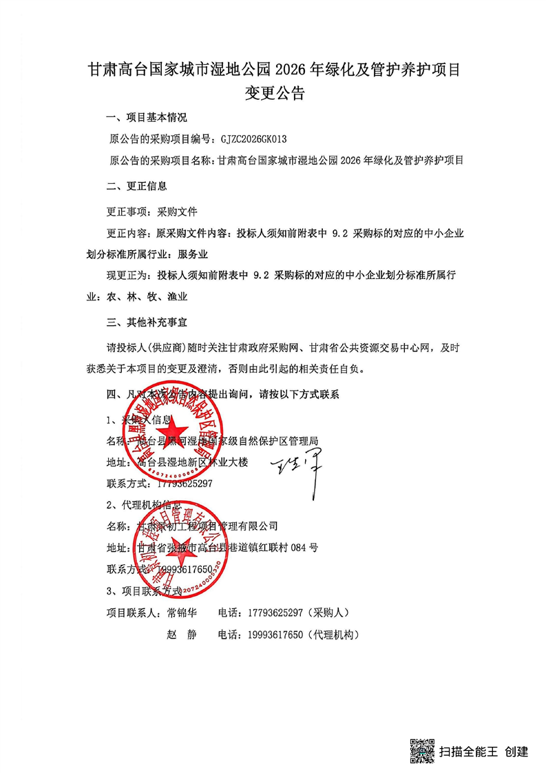 甘肃高台国家城市湿地公园2026年绿化及管护养护项目变更公告
